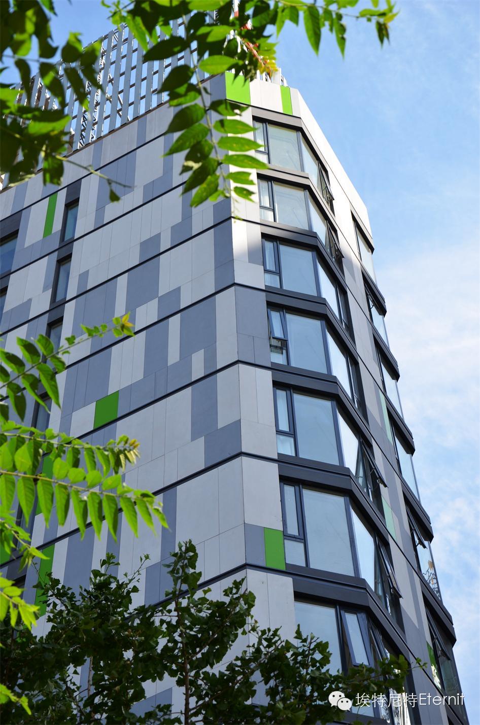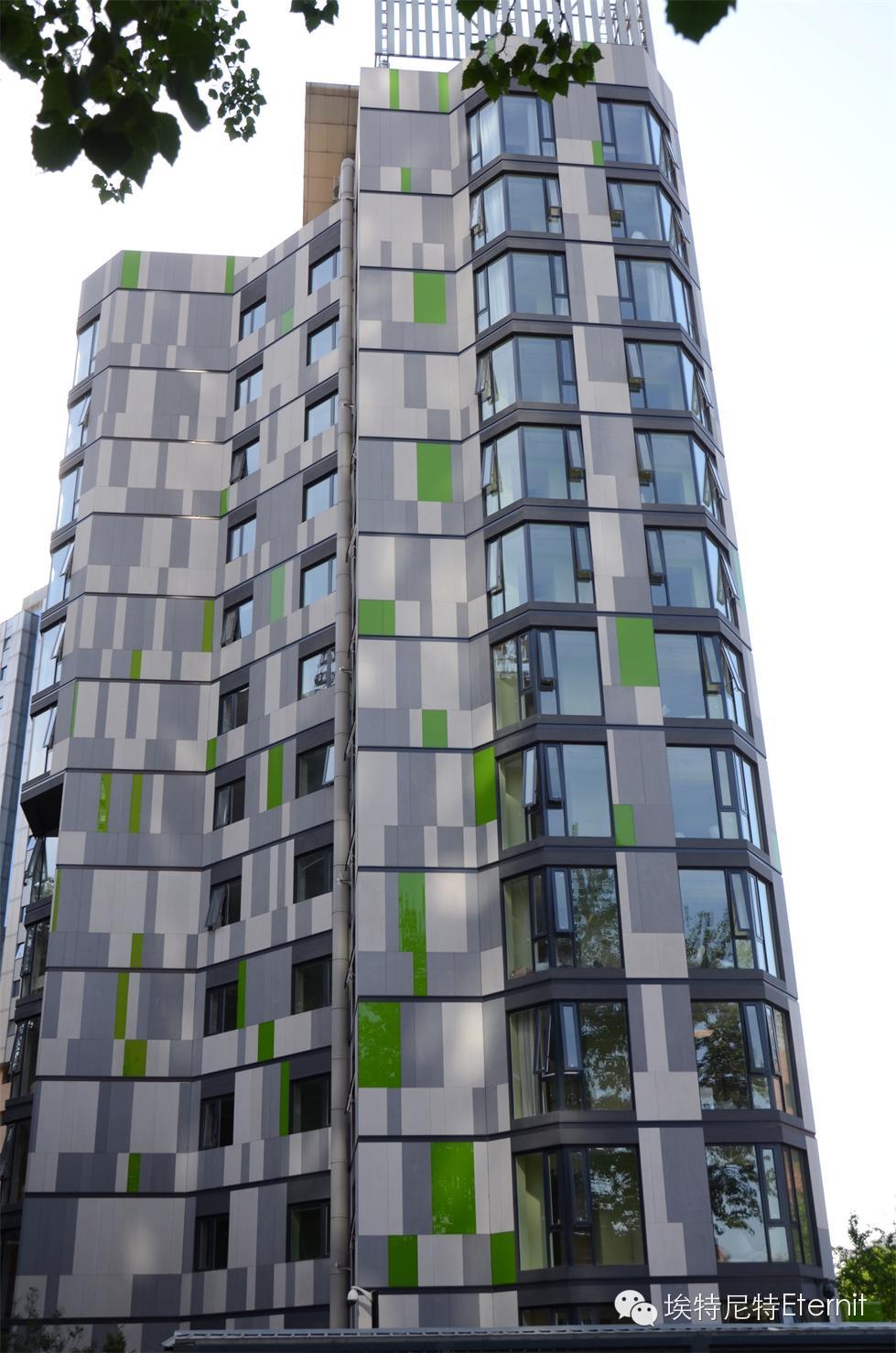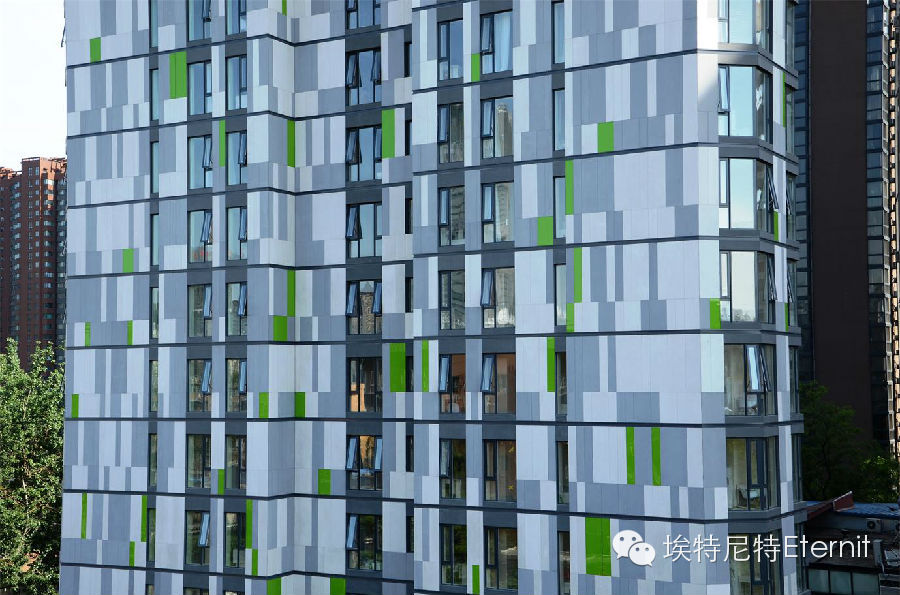 北京新派白領(lǐng)公寓由德國(guó)設(shè)計(jì)師團(tuán)隊(duì)精心設(shè)計(jì)打造,建筑外墻采用埃特尼特佳美系列外墻板,板材表面具有獨(dú)特的亞麻紋理,顏色自然生動(dòng),白色和淺灰色的經(jīng)典搭配,形成簡(jiǎn)約而時(shí)尚的現(xiàn)代建筑風(fēng)格,加上象征著生命力的綠色點(diǎn)綴,彰顯都市白領(lǐng)的青春活力,生動(dòng)地表現(xiàn)了“藝術(shù)與休閑交呼應(yīng),居住與生活相融合”的設(shè)計(jì)理念。