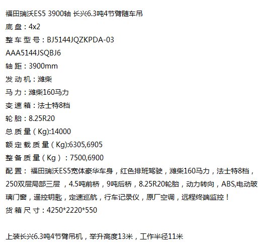 福田瑞沃ES53900軸長(zhǎng)興6.3噸4節(jié)臂隨車吊貨箱4米23濰柴160 |