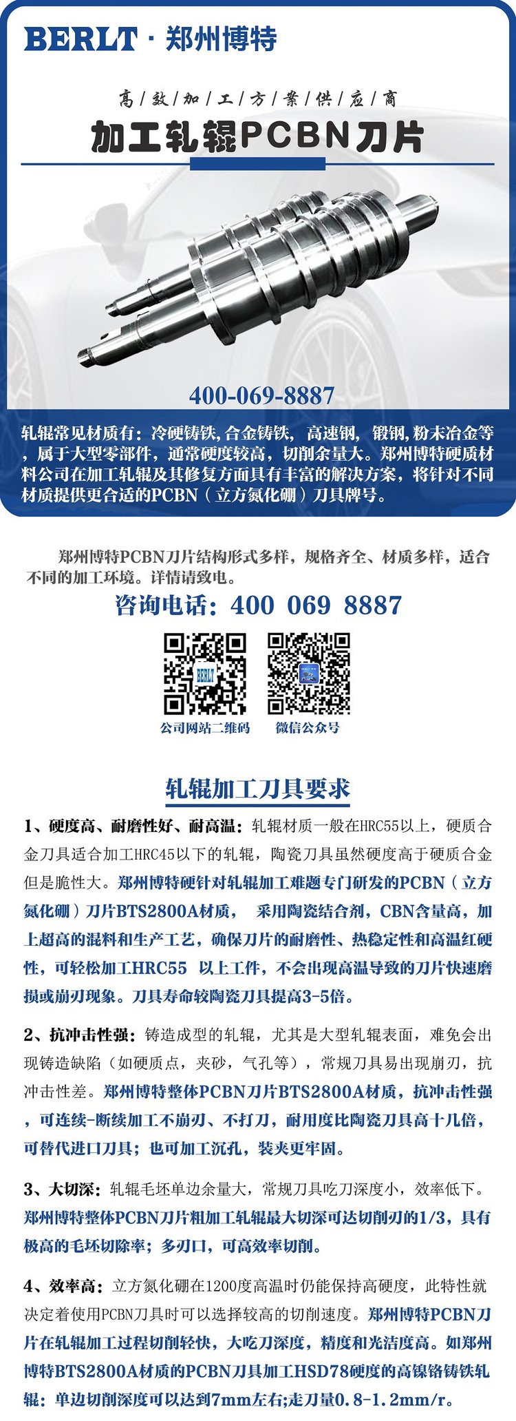 粗車(chē)軋輥刀具 粗加工冷硬鑄鐵軋輥 數(shù)控刀粒 博特刀具 ????????軋輥常見(jiàn)材質(zhì)有:冷硬鑄鐵,合金鑄鐵, 高速鋼, 鍛鋼,粉末冶金等,屬于大型零部件,通常硬度較高,切削余量大。鄭州博特硬質(zhì)材料公司在加工軋輥及其修復(fù)方面具有豐富的解決方案,將針對(duì)不同材質(zhì)提供更合適的PCBN(立方氮化硼)刀具牌號(hào);同時(shí)鄭州博特創(chuàng)新“壓窩”整體燒結(jié)刀片,裝夾更牢固、抗沖擊性更好。 ????????鄭州博特硬質(zhì)材料有限公司擁有河南省高速切削刀具工程技術(shù)研究中心和鄭州市超硬復(fù)合材料刀具工程研究中心,積極開(kāi)展產(chǎn)學(xué)研合作。二十年來(lái)鄭州博特專(zhuān)注超硬刀具制造技術(shù)和市場(chǎng)推廣應(yīng)用,為市場(chǎng)提供各種結(jié)構(gòu)形式的PCBN刀片,包括整體燒結(jié)PCBN刀片、整體焊接PCBN刀片和復(fù)合焊接PCBN刀片,以滿(mǎn)足各類(lèi)加工環(huán)境需求。 |