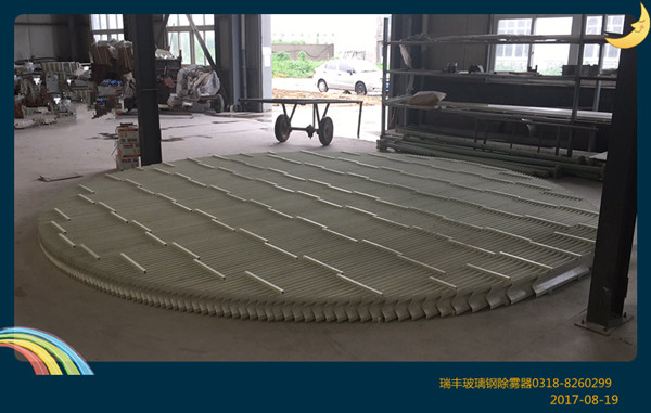 玻璃鋼除霧器主要是由波形葉片、板片、卡條等固定裝置組成,在濕法脫硫,吸收塔在運行過程中,易產(chǎn)生粒徑為10--60微米的“霧”,“霧” 不僅含有水分,它還溶有硫酸、硫酸鹽、SO2等,同時也造成風機、熱交換器及煙道的玷污和嚴重腐蝕,因此,濕法脫硫工藝上對吸收設備提出除霧的要求,被凈化的氣體在離開吸收塔之前要除霧。