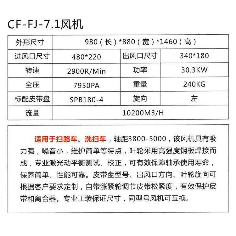 1.該風(fēng)機(jī)適用于掃路車、洗掃車、吸塵車等環(huán)衛(wèi)車車型,風(fēng)機(jī)具有吸力強(qiáng),噪音小,維護(hù)簡單等特點。 2.風(fēng)機(jī)常用型號有5.0、5.6、7.1、8.0等多種型號,各型號的詳細(xì)參數(shù)見下面產(chǎn)品詳細(xì)介紹。 3.葉輪采用高強(qiáng)度鋼板制作而成,專-業(yè)-激光平衡測試矯正,可有效保障軸承使用壽命,保養(yǎng)簡單,性-能-可-靠。 4.皮帶盤型號,出風(fēng)口方向,葉輪旋向可根據(jù)客戶要求訂制 |