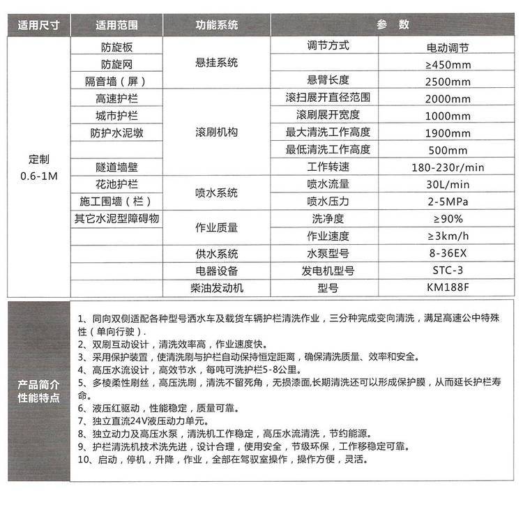 1.該護(hù)欄清洗機(jī)適用于高速護(hù)欄、城市護(hù)欄、隔音墻(屏)、防護(hù)水泥墩、隧道墻壁、花池花壇、施工圍墻(欄)、其他市政道路水泥障礙物等,可在湖北程力,中聯(lián)重科等灑水車、載貨車、環(huán)衛(wèi)車上安裝使用。 2.護(hù)欄清洗機(jī)能同向雙側(cè)清洗,3分鐘完成變向清洗,滿足高速公路單向行駛的特殊性。 3.采用保護(hù)裝置,洗刷和護(hù)欄自動(dòng)保持恒定距離,確保清洗質(zhì)量、效率和安全。 4.液壓驅(qū)動(dòng), ,啟停機(jī)、升降、作業(yè)、全部在駕駛室操作,操作方便靈活。 |