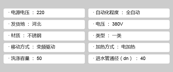 產(chǎn)品參數(shù) | 電源電壓 | 220V | 額定功率 | 50KW | 加熱方式 | 電加熱 | 凈重 | 100公斤kg | 類型 | 一類 | 驅(qū)動方式 | 電壓 | 洗滌介質(zhì) | 水 | 洗滌容量 | 50L | 自動化程度 | 全自動 | 電壓 | 380V | 進水管通徑(dn) | 40 | 電機功率 | 5.5 | 發(fā)貨地 | 河北 | 材質(zhì) | 不銹鋼 | 加工定制 | 否 | 品牌 | 美滌 | | .jpg)