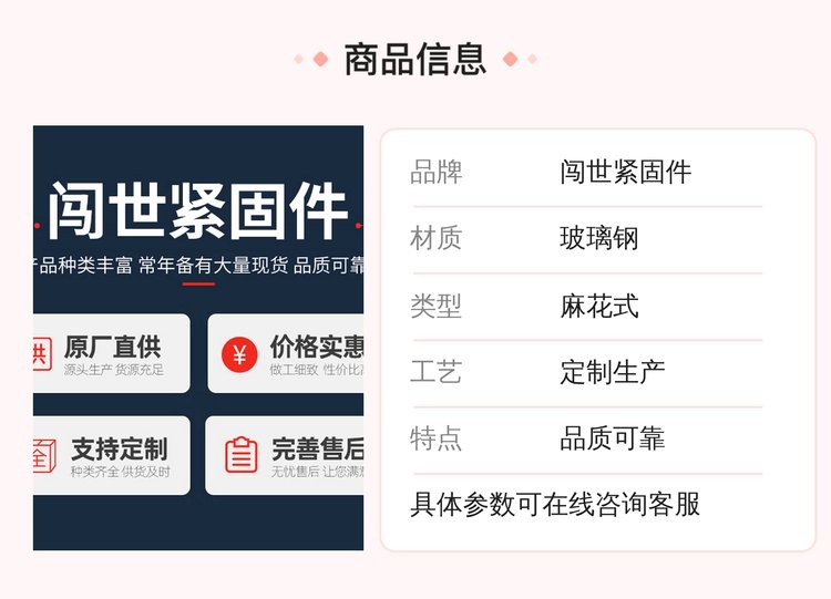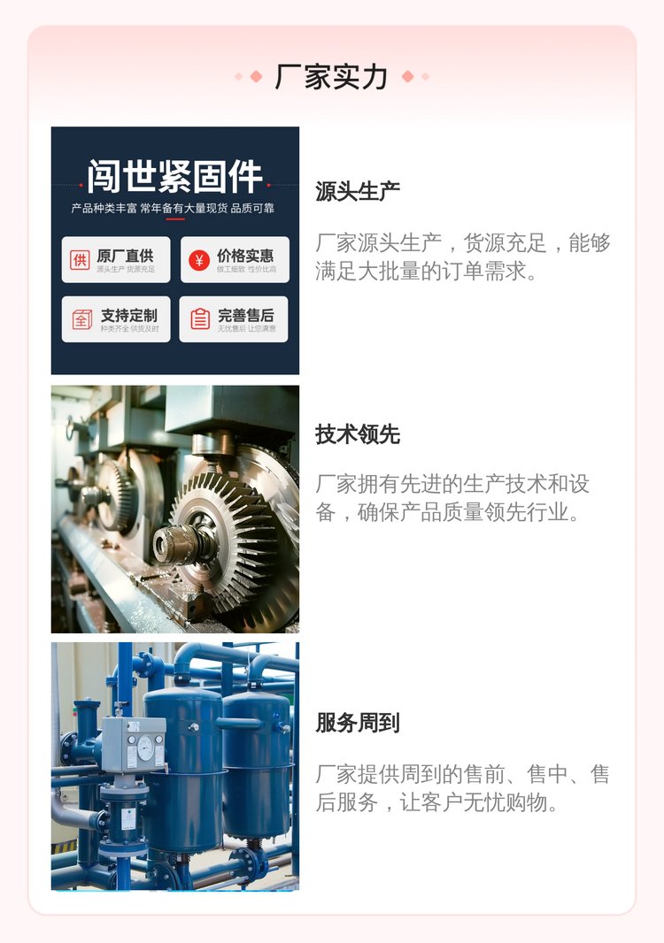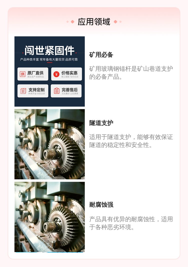 ![]() ![]() ![]() ![]() 邯鄲市闖世緊固件有限公司是一家產(chǎn)、銷為一體的工礦配件廠家,本廠主要生產(chǎn)銷售:麻花式錨桿、螺紋右旋錨桿、螺紋左旋錨桿、玻璃鋼錨桿、礦用勾花網(wǎng)、礦用塑料網(wǎng)、礦用焊接網(wǎng)、礦用W鋼帶等產(chǎn)品,支持按需定制生產(chǎn)。 |