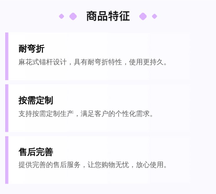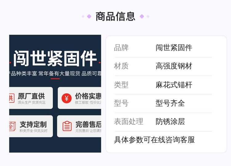 ![]() ![]() ![]() ![]() 邯鄲市闖世緊固件有限公司是一家產(chǎn)、銷為一體的工礦配件廠家,本廠主要生產(chǎn)銷售:麻花式錨桿、螺紋右旋錨桿、螺紋左旋錨桿、玻璃鋼錨桿、礦用勾花網(wǎng)、礦用塑料網(wǎng)、礦用焊接網(wǎng)、礦用W鋼帶等產(chǎn)品,支持按需定制生產(chǎn)。 |