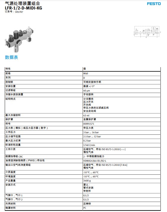 德國(guó)FESTO費(fèi)斯托LFR-1\/2-D-MIDI-KG氣源處理裝置組合185787 |