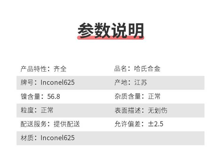 產(chǎn)品參數(shù) | 產(chǎn)品特性 | 齊全 | 品名 | 哈氏合金 | 牌號 | Inconel625 | 產(chǎn)地 | 江蘇 | 鎳含量 | 56.8 | 雜質(zhì)含量 | 正常 | 粒度 | 正常 | 表面描述 | 無劃傷 | 配送服務(wù) | 提供配送 | 允許偏差 | ±2.5 | 可售賣地 | 全國 | 材質(zhì) | Inconel625 | |