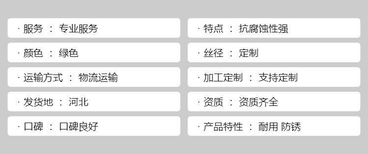 產(chǎn)品參數(shù) | 顏色 | 綠色 | 規(guī)格 | 多種規(guī)格 | 服務(wù) | 專業(yè)服務(wù) | 孔型 | 方形孔 | 加工定制 | 支持定制 | 銷售方式 | 產(chǎn)家直銷 | 產(chǎn)地 | 衡水 | 口碑 | 口碑良好 | 絲徑 | 定制 | 發(fā)貨地 | 河北 | 公司保障 | 實力雄厚 | 貨源 | 貨源充足 | 售賣地 | 全國 | 資質(zhì) | 資質(zhì)齊全 | 品質(zhì) | 過硬品質(zhì) | 可售賣地 | 全國 | | .jpg)