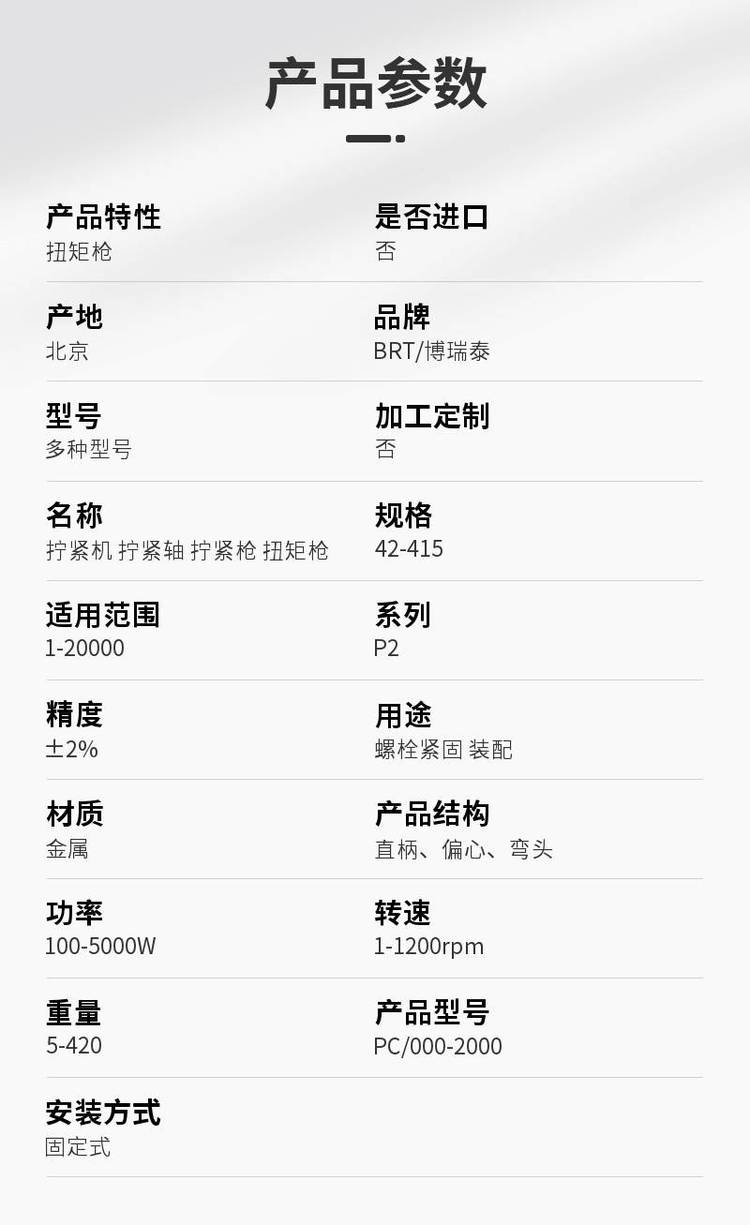 產(chǎn)品參數(shù) | 品牌 | BRT/博瑞泰 | 產(chǎn)品特性 | 扭矩槍 | 是否進口 | 否 | 產(chǎn)地 | 北京 | 加工定制 | 否 | 名稱 | 擰緊機 擰緊軸 擰緊槍 扭矩槍 | 規(guī)格 | 42-415 | 適用范圍 | 1-20000 | 系列 | P2 | 精度 | ±2 | 產(chǎn)品結(jié)構(gòu) | 直柄、偏心、彎頭 | 功率 | 100-5000W | 轉(zhuǎn)速 | 1-1200rpm | 重量 | 5-420 | 產(chǎn)品型號 | PC/000-2000 | 安裝方式 | 固定式 | 可售賣地 | 全國 | 用途 | 螺栓緊固裝配 | 材質(zhì) | 金屬 | 型號 | 多種型號 | |