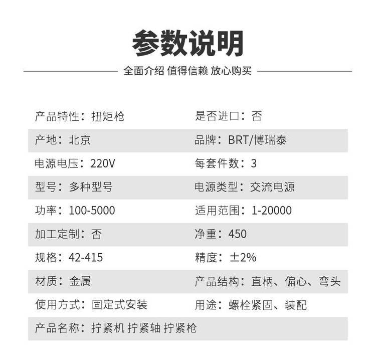 產(chǎn)品參數(shù) | 品牌 | BRT/博瑞泰 | 產(chǎn)品特性 | 扭矩槍 | 是否進(jìn)口 | 否 | 產(chǎn)地 | 北京 | 電源電壓 | 220V | 每套件數(shù) | 3 | 電源類型 | 交流電源 | 功率 | 100-5000 | 適用范圍 | 1-20000 | 加工定制 | 否 | 凈重 | 450 | 規(guī)格 | 42-415 | 精度 | ±2 | 產(chǎn)品結(jié)構(gòu) | 直柄、偏心、彎頭 | 使用方式 | 固定式安裝 | 產(chǎn)品名稱 | 擰緊機(jī) 擰緊軸 擰緊槍 | 可售賣地 | 全國(guó) | 用途 | 裝配 | 材質(zhì) | 金屬 | 型號(hào) | 多種型號(hào) | |