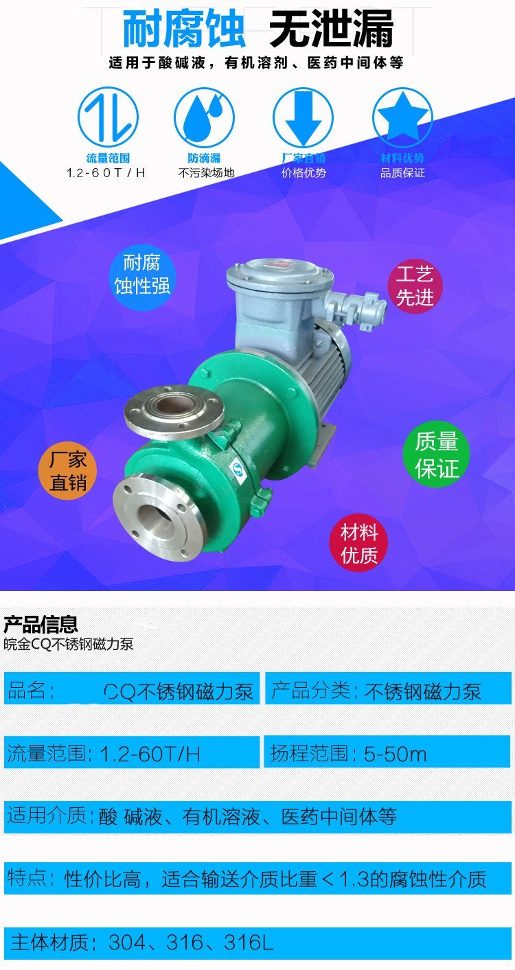 一、概述: ? ??在石油、化工、制藥、電子等眾多領(lǐng)域,越來越多的廠家,對其輸送的介質(zhì)都要求無泄漏的工藝環(huán)境,迫切需要選擇理想的泵型,我公司生產(chǎn)的CQ系列磁力泵吸收了國內(nèi)外領(lǐng)先水平的磁力泵生產(chǎn)新技術(shù)、新材料、新工藝,成功的解決了目前國內(nèi)磁力泵的隔離套、葉輪等部件易損壞的技術(shù)難題,使其性能更加完美化。CQ、CQF系列磁力泵經(jīng)過使用單位長時間的生產(chǎn)性連續(xù)運行考驗,越來越多的用戶確信他們所選的是最安全、最可靠的泵型,我們將一如既往的為廣大用戶提供更加優(yōu)質(zhì)的服務。 ????CQ型不銹鋼磁力泵是利用永磁聯(lián)軸器工作原理無接觸的傳遞扭矩的新型泵,當原動機帶動外磁鋼轉(zhuǎn)子時,通過磁場的作用驅(qū)動內(nèi)磁鋼轉(zhuǎn)子同步旋轉(zhuǎn),而內(nèi)磁鋼轉(zhuǎn)子和葉輪連成一體,從而達到無接觸帶動葉輪轉(zhuǎn)動之目的。由于液體被封閉在靜止的隔離套內(nèi),所以磁力泵是一種全封閉、無泄漏的泵型,因此完全杜絕了機械密封離心泵不可避免的跑、冒、滴、漏的弊病。 二、用途: ? ?泵的過流部件采用不銹鋼(304、316L)制成,廣泛應用于石油、化工、制藥、電鍍、環(huán)保、水處理、國防等部門,是輸送易燃、易爆、有毒和貴重液體的理想設(shè)備,是創(chuàng)建無泄漏、無污染文明車間的最佳選擇。 三、適用溫度: ??? 該泵的正常適用溫度為100度以內(nèi),如果需輸送高溫介質(zhì),可定做為高溫型,適用溫度可以在200度以內(nèi),也可定做帶保溫夾套對輸送的高溫介質(zhì)進行保溫。 ? 性能參數(shù):