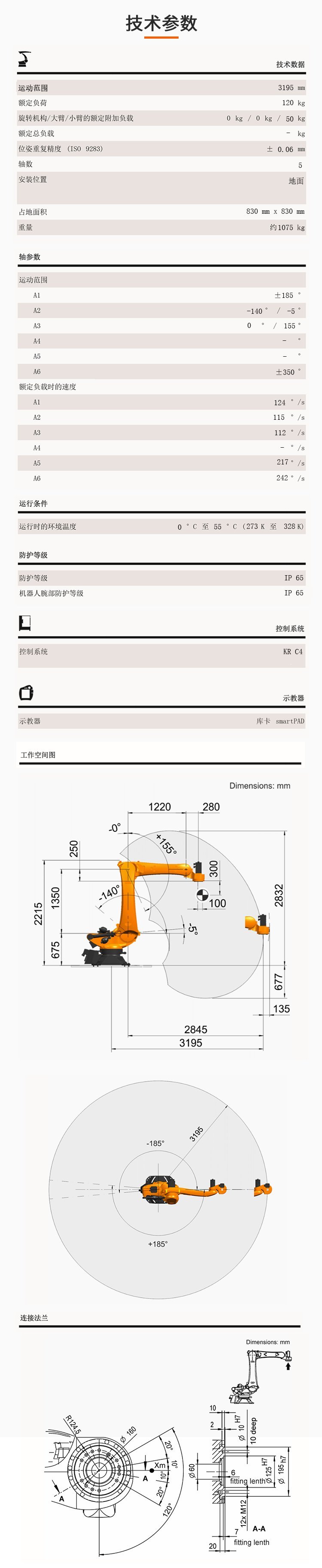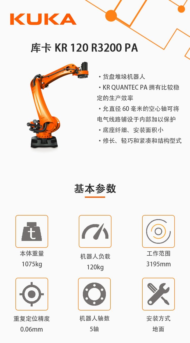 庫卡機器人KR120R3200PA大范圍的碼垛搬運臂展3195mm |
