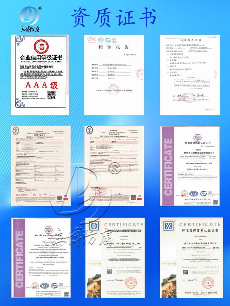 陽極自溶性小,電流效率高,陽極發(fā)生電流的自調(diào)節(jié)性能好;保護(hù)年限較長,可達(dá)20~30年,一般不會發(fā)生“過保護(hù)”現(xiàn)象。鋅合金犧牲陽極適用于海水、淡海水介質(zhì)中的船舶、壓載水艙、機(jī)械設(shè)備、海洋工程和海港設(shè)施、鉆井平臺、港口碼頭、海水介質(zhì)的冷凝器、水泵以及低電阻率土壤中的管道、電纜等設(shè)施金屬防腐蝕的陰極保護(hù)。 ![]() |