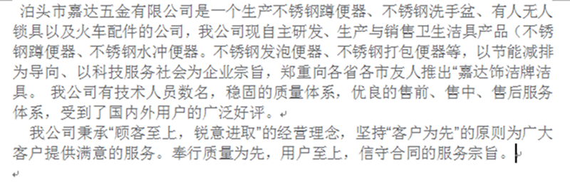 產(chǎn)品參數(shù) | | 材料 | 304不銹鋼 | 加工方式 | 焊接沖壓 | 使用方式 | 機(jī)械打包 | 顏色 | 不銹鋼本色 | 有無前擋水 | 有 | 廠家 | 嘉達(dá)五金 | 產(chǎn)地 | 河北 | 加工定制 | 支持 | 名稱 | 不銹鋼機(jī)械打包蹲便器 | 種類 | 打包式 | 最小坑距 | 745*565mm | 是否跨境貨源 | 否 | 是否現(xiàn)貨 | 是 | 是否出口 | 否 | 可售賣地 | 國內(nèi) | 品牌 | 嘉達(dá)五金 | |