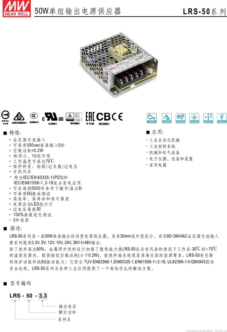 LRS-50-36燈帶監(jiān)控驅(qū)動開關(guān)電源明緯電源50W36V |