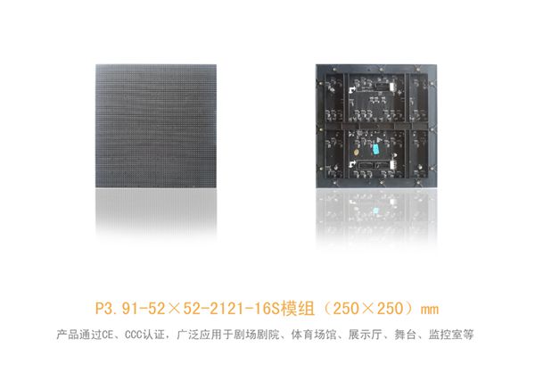 P3.91室內(nèi)LED租賃屏技術(shù)參數(shù): 像素點間距(mm):3.91像素點密度(點/m2):65536 像素點配置:1R1G1B LED燈封裝形式:SMD2121黑燈 灰度級別:>4096 顯示顏色(M):16.7 刷新頻率(Hz):>3840 顯示屏亮度(cd/m2):>1200 換幀頻率(Hz):60 模組像素點排列:64*64 箱體像素點排列:128*128 模組尺寸(mm*mm):250*250 箱體尺寸(mm*mm):500*500*63 (方便搭建成整平方) 箱體厚度(mm):63 箱體重量(Kg):6.25-7 箱體材質(zhì):壓鑄鋁 模組最大功耗(W):45 箱體平均功耗(W/箱):80 箱體最大功耗(W/箱):200 亮度調(diào)節(jié)級別(Level):256 電源輸入電壓:AC90V~230V 驅(qū)動方式:恒流驅(qū)動電源 輸入頻率(Hz):50/60 掃描方式:1/16 水平視角(Deg):160 垂直視角(Deg):100 防護等級:IP54 工作溫度范圍(℃):-20~ +40 箱體像素點排列(Px*Px):96*96 工作濕度范圍(RH):10%~90% 存貯溫度范圍(℃):-40~ +80 存貯濕度范圍(RH):10%~90% 使用壽命(H):100,000 http://www.szjcyled.comP3.91 租賃屏模組照片;