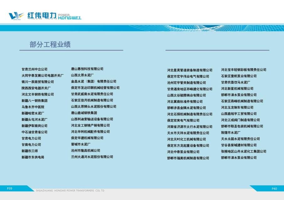 石家莊紅偉電力變壓器有限公司 本公司主要生產S9\S11/S13 SCB系列電力變壓器、接地、電爐、礦用、預裝式變電站?筛鶕蛻粢笤O計各種特殊用途、特殊型號變壓器。企業(yè)已通過LSO9001:2000國際質量體系認證,“榮獲AAA級信譽企業(yè)”,并被中國商品質量名優(yōu)品牌推廣中心授予“中國著名品牌”稱號