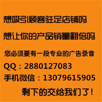 我們的聲音是專業(yè)央視電臺(tái)的聲音!比質(zhì)量,比效果,精明的人都知道效果好,銷量才會(huì)好,助您增加客流量,讓您的暑期不在放假,給您帶來不同凡響的效果!專業(yè)錄制各種廣告錄音、店鋪賣場、活動(dòng)促銷、宣傳車廣告、清倉大甩賣、地?cái)偨匈u、課件、專題等,經(jīng)濟(jì)實(shí)惠,抓緊時(shí)間為您店鋪制作宣傳吧!!! 企業(yè)QQ:2880-127-083,微信/熱線同號:130-7961-5905. 全國各地都有我們的客戶,因?yàn)槲覀兊膬r(jià)格低,音質(zhì)好,需要做宣傳語音的,當(dāng)天完成。我們的主營項(xiàng)目有:女聲廣告錄音,服裝促銷廣告語錄音,ppt配音廣告制作,粵語配音,英語配音,藏語配音,喊麥錄音制作 讓你的店面不再冷清 --------------------------參考詞模板-------------------------- 派高多功能電暖爐廠家直銷 全城 價(jià)銷售 集烤火 火鍋 餐桌 娛樂等多功能于一體 方便實(shí)用 安全衛(wèi)生 美觀耐用 遠(yuǎn)紅外加熱 健康節(jié)能 單面取暖功率 100W 派高電暖爐采用微電腦控制 全程漏電保護(hù) 通過 3C認(rèn)證 太平洋保險(xiǎn)公司承保。公司鄭重承諾,如有質(zhì)量問題一年包換,五年保修,終身維護(hù)。送父母 送親戚 送朋友 送領(lǐng)導(dǎo) 新婚搬新家必備電器,相信您擁有派高電暖爐,家旺,火旺,財(cái)更旺。 ------------------------------------------------------------- 因經(jīng)營不善廣告語錄音,廣告詞參考,專業(yè)廣告錄音制作 可以現(xiàn)在加我們的客服企業(yè)QQ:2880-127-083,微信/熱線同號:130-7961-5905 索取報(bào)價(jià)。 。 企業(yè)QQ:2880-127-083,微信/熱線同號:130-7961-5905. ![]() 要想生意做的好,錄音廣告少不了,有聲音,才有生意。錄音找天天,天天有生意。央視品質(zhì),平民價(jià)格。本音頻廣告由天天錄音網(wǎng)制作,天天錄音網(wǎng),祝您生意天天旺,制作廣告錄音,不間斷循環(huán)播放來宣傳你的產(chǎn)品,從此生意沒有淡季。每天幾百上千人路過你的店鋪,有多少人會(huì)留意你的生意?制作一條這樣的廣告錄音,循環(huán)播放宣傳你的商品,每天進(jìn)店顧客翻倍增加。您的店鋪客流量大嗎?每天路過您店鋪的人多嗎?制作一段宣傳錄音,可以讓進(jìn)店顧客翻倍增加。選擇天天錄音網(wǎng),生意當(dāng)然天天旺!現(xiàn)在就加客服Q2880-127-083配音熱線:130-7961-5905 |