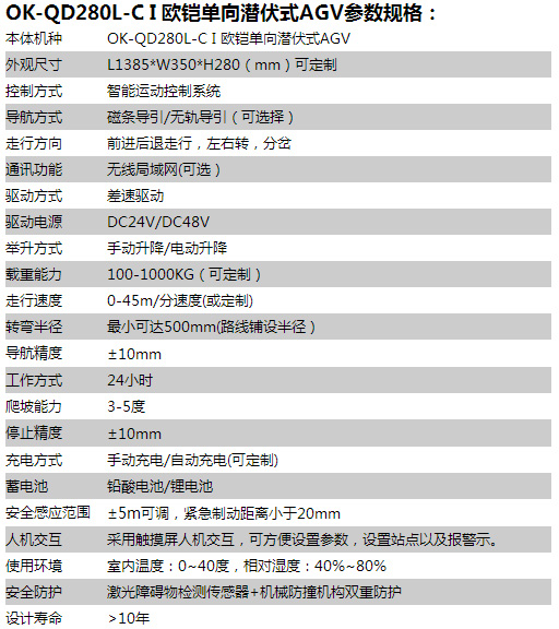 歐鎧超短型單向潛伏AGV,車身長1385mm,寬350mm,車體高度280mm,可以方便潛入牽引各種料車,承載量大,方便操作維護,行駛穩(wěn)定,適用于物料供應(yīng)量大的柔性生產(chǎn)線。
