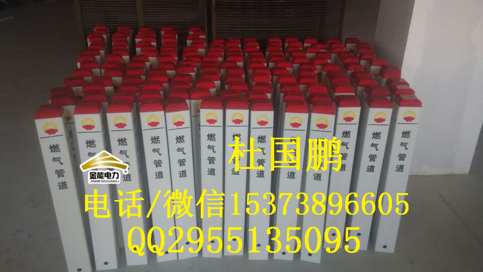 復(fù)合材料燃?xì)鈽?biāo)志樁,警示牌,標(biāo)志磚。廣泛應(yīng)用于電 力、天然氣、供水 、通信 、污水、石油、石化、礦山等管線(xiàn)地埋隱蔽工程。 復(fù)合材料燃?xì)鈽?biāo)志樁特點(diǎn): 1、燃?xì)鈽?biāo)志樁材料:高強(qiáng)度玻璃纖維復(fù)合 材料模壓制作(回收無(wú)用)。 2、復(fù)合材料燃?xì)鈽?biāo)志樁產(chǎn)品表面文字用特種絲印及 凹型處理,一次著色固化成型。 3、復(fù)合材料燃?xì)鈽?biāo)志樁顏色艷麗、抗老化、強(qiáng)度好,使 用壽命可達(dá)30年以上。 4、復(fù)合材料燃?xì)鈽?biāo)志樁真正免維護(hù),不同于水泥、石頭等材料需 要定時(shí)每年去上油漆、噴字,省卻維護(hù)工時(shí)費(fèi)用,產(chǎn)品表面文字基礎(chǔ)堅(jiān)硬,耐磨持久。也可按用戶(hù)單位提供的樁號(hào),里程數(shù), 路徑方向指示箭頭,維護(hù)電話(huà)等信息資料逐個(gè)定做。 5、復(fù)合材料燃?xì)鈽?biāo)志樁安裝方法:挖掘所埋深度坑,前后左右十字交叉穿 入兩根25 CM鋼筋,水泥石子固定即可。圓形路面磚采用圓形開(kāi)孔器按所需大小管道穿越路 面打孔,下部用水泥濃漿固定,上口與路面齊平即可。 6、復(fù)合材料燃?xì)鈽?biāo)志樁全方位工程給甲方單 位提升企業(yè)標(biāo)準(zhǔn)化管理新形象,具體尺寸可按要求定制。 7、復(fù)合材料燃?xì)鈽?biāo)志樁相關(guān)技術(shù)數(shù)據(jù): 1、拉伸強(qiáng)度≥160MPa 2、彎曲 強(qiáng)度≥190MP 3、浸水后彎曲強(qiáng)度≥150MPa 4、巴氏硬度≥38 5、環(huán)鋼度(5%)≥50KPa 6、熱變形溫度≥160℃ 7、氧指數(shù)26% 小杜 15373896605 qq:2955135095