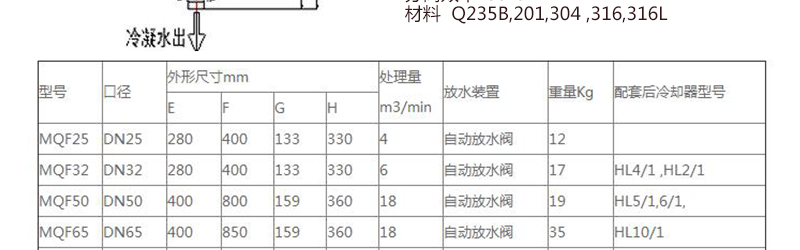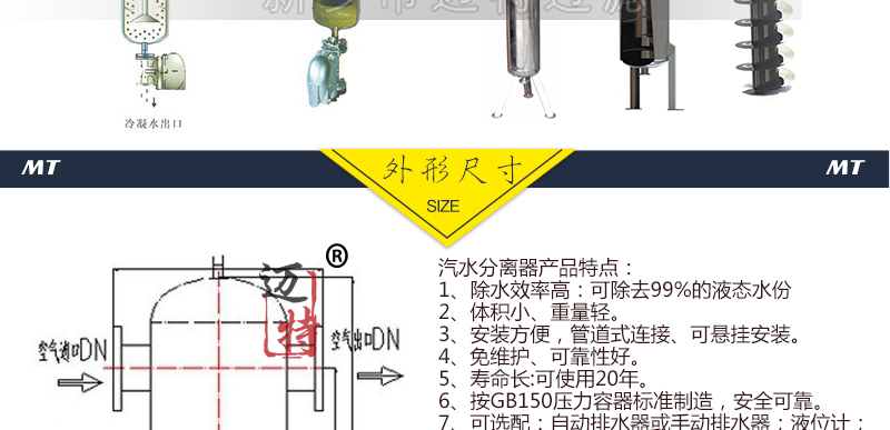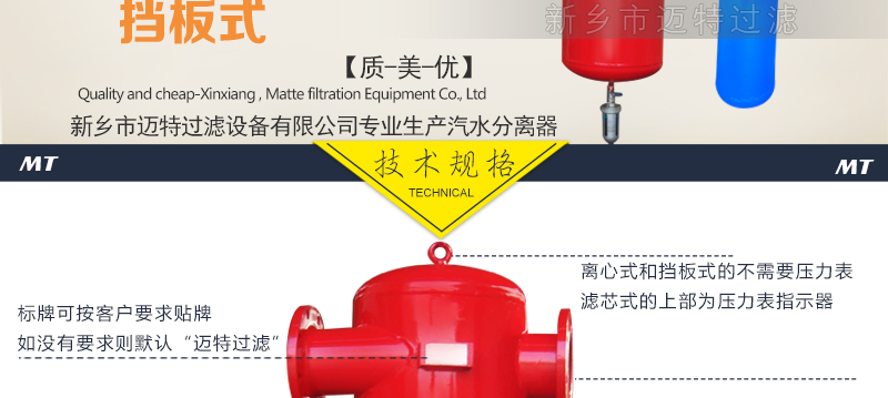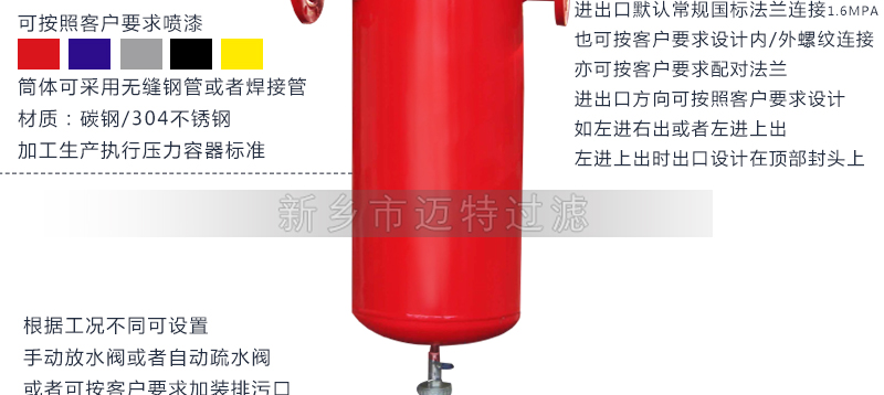 汽水分離器 設(shè)備優(yōu)點(diǎn): 1、本產(chǎn)品 2、不增加管道負(fù)重可除去99%以上的液態(tài)水。 3、體積小、重量輕,減輕管道負(fù)重。 4、安裝方便,,可懸掛安裝同時(shí)可以安裝吊環(huán)。 5、可選配:自動(dòng)排水器或手動(dòng)排水器;液位計(jì)等。 6、材料:碳鋼和不銹鋼。 7、使用溫度:≤80℃。(高溫情況下,需特殊要求)