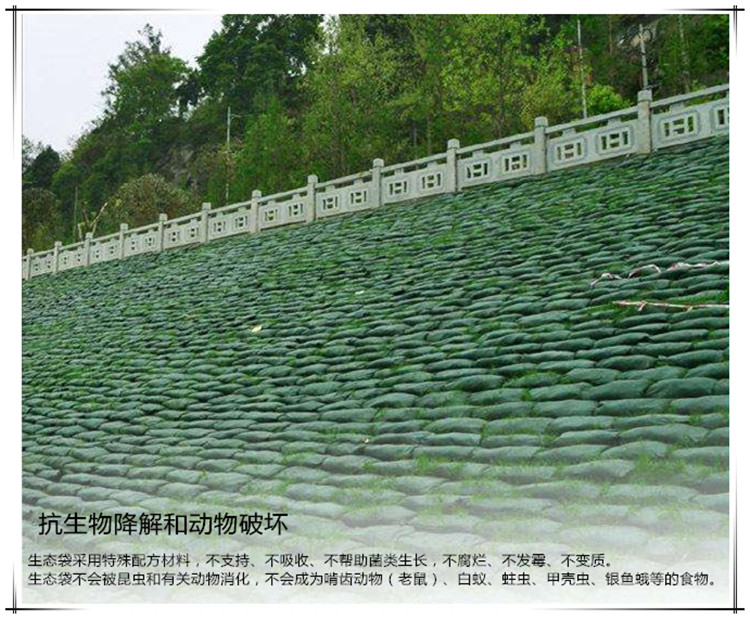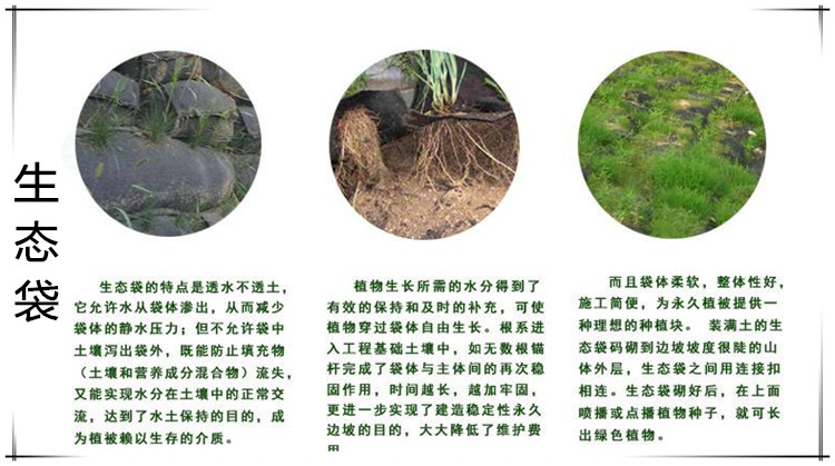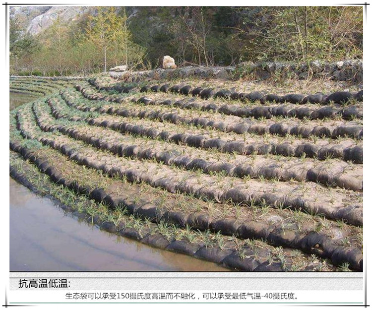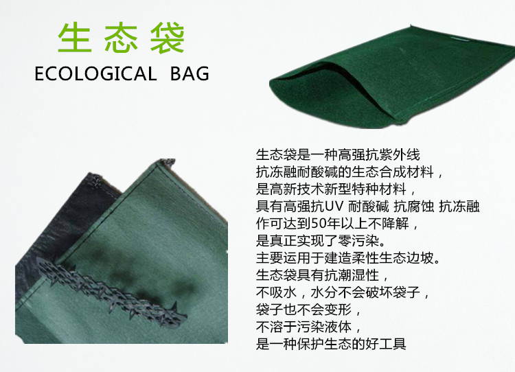生態(tài)袋是一種高強(qiáng)抗紫外線抗凍融耐酸堿的生態(tài)合成材料,是高新技術(shù)新型特種材料,具有高強(qiáng)抗UV 耐酸堿 抗腐蝕 抗凍融 作可達(dá)到50年以上不降解,是真正實(shí)現(xiàn)了零污染。主要運(yùn)用于建造柔性生態(tài)邊坡。生態(tài)袋具有抗潮濕性,不吸水,水分不會(huì)破壞袋子,袋子也不會(huì)變形,不溶于污染液體,是一種保護(hù)生態(tài)的好工具,很實(shí)用