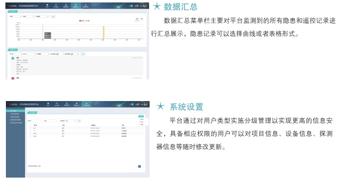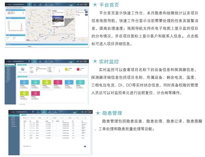 AcrelCloud-6000安全用電管理云平臺(tái)采用自主研發(fā)的剩余電流互感器、溫度傳感器和電氣火災(zāi)探測(cè)器,對(duì)引發(fā)電氣火災(zāi)的主要因素(導(dǎo)線溫度、電流和剩余電流)進(jìn)行不間斷的數(shù)據(jù)跟蹤與統(tǒng)計(jì)分析,并將發(fā)現(xiàn)的各種隱患信息及時(shí)推送給企業(yè)管理人員,指導(dǎo)企業(yè)實(shí)現(xiàn)第一時(shí)間的排查和治理,達(dá)到消除潛在電氣火災(zāi)安全隱患,實(shí)現(xiàn)“防患于未然”的目的。