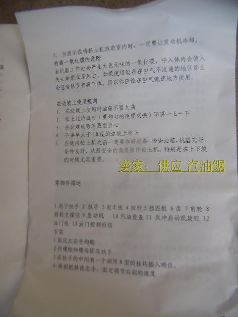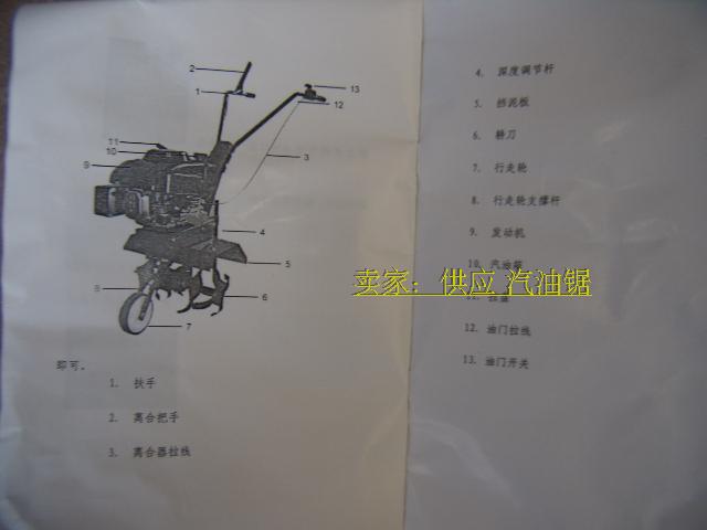 松土快捷,方便,是家用,小莊園的得力助手. 旋耕松土機(jī)是根據(jù)我國廣大丘陵,山區(qū),地塊小,高差大,又無機(jī)耕道而設(shè)計的。以小型汽油機(jī)為動力,以皮帶離合器作為傳動,具有重量輕,體積小,結(jié)構(gòu)簡單,操作方便,易于維修,油耗低,生產(chǎn)效率高等特點(diǎn)。 用于田間耕作,也可用于蔬菜大棚,苗圃,果園,茶園的管理,深受廣大用戶的喜愛。 圍擋泥及前輪驅(qū)動,讓你用的更安全本款機(jī)型產(chǎn)用4.5馬力四沖程汽油發(fā)動機(jī),功率強(qiáng)勁,穩(wěn)定。耕寬400毫米,耕深大150毫米,具體看土質(zhì)。 請大家使用的時候,加入四沖程專用機(jī)油,如果不加機(jī)油產(chǎn)生的問題,自己承擔(dān)。 實物圖: