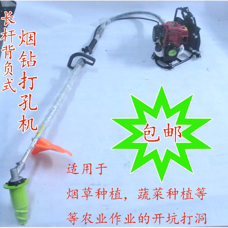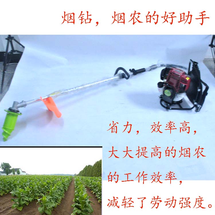 成功的代替了,鋤頭,鏟子。煙農(nóng)作為煙葉生產(chǎn)的執(zhí)行者和主力軍,是發(fā)展現(xiàn)代煙草農(nóng)業(yè)的重要組成部分。近幾年,隨著科技的進(jìn)步,為此,我們公司推出服務(wù)于煙農(nóng),提高煙農(nóng)的效率,減輕煙農(nóng)的勞動負(fù)擔(dān),特推出----煙鉆。這款煙葉移栽打孔機(jī)設(shè)計合理,操作簡單,效率高,能夠滿足煙葉移栽井窖打孔需要,是一款理想的小型農(nóng)機(jī)具! 本實用新型公開了背負(fù)式烤煙小苗移栽打孔機(jī),該打孔機(jī)由作業(yè)手柄、機(jī)體、發(fā)動機(jī)、拉桿、油門拉線、動力管、鉆頭、定位器、背具和控制開關(guān)構(gòu)成; 發(fā)動機(jī)固定在背具上,拉桿連接在發(fā)動機(jī)上;油門拉線與動力管的一端連接發(fā)動機(jī),另一端連接在一支作業(yè)手柄上;控制開關(guān)固定在同一支作業(yè)手柄上;機(jī)體的下部與定位器連接,機(jī)體底部安裝有鉆頭。