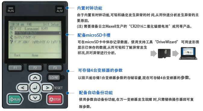 您是否在調(diào)整或故障修復(fù)上花了不少功夫? 通過(guò)利用煥然一新的操作器和對(duì)話方式的向?qū)Чδ埽蠓s短了設(shè)定時(shí)間及停機(jī)時(shí)間。 無(wú)需主回路電源也可確認(rèn)異常時(shí)的狀態(tài) 通過(guò)接通DC24 V控制電源,無(wú)需接通主回路電源即可 確認(rèn)異常狀態(tài),且可安全地進(jìn)行修復(fù)作業(yè)。 無(wú)需主回路電源也可進(jìn)行參數(shù)設(shè)定 通過(guò)單一的操作器即可對(duì)變頻器的參數(shù)進(jìn)行管理。通 過(guò)將操作器與計(jì)算機(jī)之間進(jìn)行USB連接,即使沒(méi)有變 頻器主體也可在操作器內(nèi)進(jìn)行參數(shù)編輯。即使在無(wú)法準(zhǔn)備主回路電源的情況下也可事先進(jìn)行必要的設(shè)定
