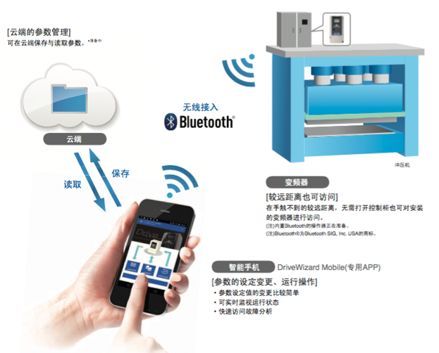 智能手機(jī)應(yīng)用 DriveWizard Mobile 我們提供與變頻器進(jìn)行無(wú)線連接和參數(shù)的云端管理等有效利用智能手機(jī)的新型支持方式