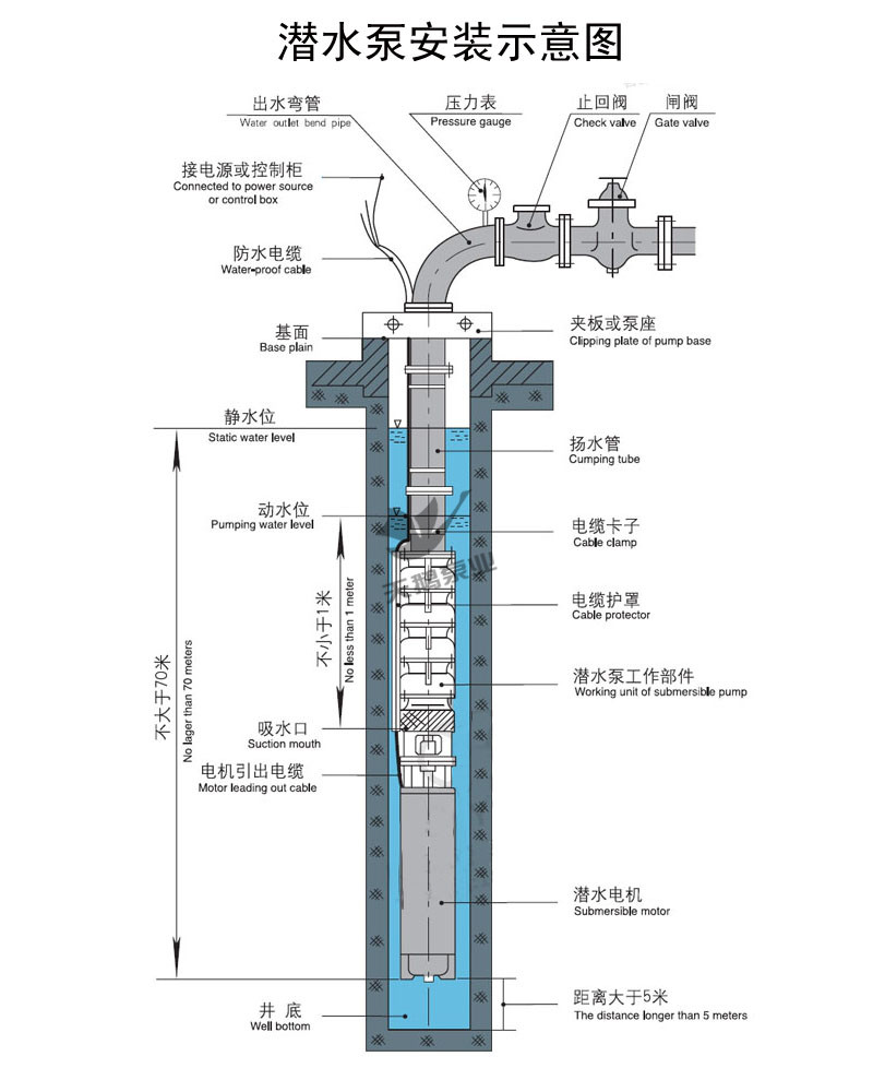 功率 3 材質(zhì) 不銹鋼 類別 深井潛水泵 流量 5 排出口徑 40mm 驅(qū)動(dòng)形式 電動(dòng) 吸入口徑 40mm 性能 自動(dòng) 揚(yáng)程 100 葉輪數(shù)量 多級(jí) 原理 轉(zhuǎn)子泵 轉(zhuǎn)速 2900 泵軸位置 邊立式 品牌 天鵝 型號(hào) 150qj5-100/14 加工定制 是 進(jìn)出水口徑 dn40 詳細(xì)說明 所有產(chǎn)品價(jià)格均為展示價(jià)格,如需報(bào)價(jià)請(qǐng)聯(lián)系業(yè)務(wù)人員核定 不銹鋼深水泵井用深水泵150qj5-100/14概述 ![]() qj系列潛水泵廣泛用于農(nóng)田排灌、噴灌井用提水,工業(yè)及民用建筑的供、排水系統(tǒng),以及丘陵、山區(qū)的引水,低洼地區(qū)的排澇,城鄉(xiāng)工礦企業(yè)供水、排水等各種水利設(shè)施。 其特點(diǎn)是電機(jī)、水泵、組裝成一體,結(jié)構(gòu)簡(jiǎn)單,安裝拆卸方便,占地面積小,使用維護(hù)簡(jiǎn)單,運(yùn)轉(zhuǎn)安全可靠,不污染水源等特點(diǎn)。 ![]() 深井泵井用深水泵井用深水泵150qj5-100/14使用須知 1電機(jī)使用前必須注滿清水,擰緊注水、放氣螺絲,否則不準(zhǔn)使用。 2.陸地試運(yùn)轉(zhuǎn)不超過1秒, 3.電泵不準(zhǔn)倒臥或傾斜使用 4.保證電泵運(yùn)行過程中完全侵入水中,但漫入深度不大于靜水位70米,并且要求電機(jī)周圍水流速 不小于0.1米/秒 5.當(dāng)流量大于等于320m h時(shí),要保證電泵的吸水口在動(dòng)水位以下不小于2m的位置 6 當(dāng)流量大于等于320m? h時(shí),且電泵在特殊使用場(chǎng)合,如池塘、淺井、蓄水池等,必須配帶吸筒 深井泵井用深水泵150qj5-100/14使用條件 井用潛水電泵是電機(jī)與水泵直連一體潛入水中工作的提水機(jī)具。主要適用于農(nóng)田灌溉、城市、] 礦企業(yè)的給排水工程及地?zé)衢_發(fā)利用,冬季供暖工程等方面。 1.電源要求: (1)額定頻率為50h2,電機(jī)端額定電壓應(yīng)保證為380+ 5%v,或660+ 5%v的三相交流電源(用戶 電壓為600v時(shí)需說明) (2) 變壓器負(fù)載功率不應(yīng)超過其容量的75%. (3) 變壓器距井較遠(yuǎn)時(shí),應(yīng)考慮輸電線的線壓降,保證電機(jī)端電壓380 56v.或660258v允許 配套電纜的最大長(zhǎng)度和電纜線芯鞭面積的對(duì)應(yīng)關(guān)系見附表3 2.井簡(jiǎn)要求: 正直、光得。不得有凸起或井管銷位現(xiàn)象。井內(nèi)徑不小于相應(yīng)的機(jī)座號(hào) 3.水質(zhì)要求: 深井泵井用深水泵150qj5-100/14安裝圖 ![]() 井用深水泵300qj140-168/8生產(chǎn)到安裝圖 ![]() ![]() ![]() 機(jī)電之家網(wǎng)廠家山西天鵝泵業(yè)有限公司為您提供原裝不銹鋼深井泵促銷的詳細(xì)產(chǎn)品價(jià)格、產(chǎn)品圖片等產(chǎn)品介紹信息,您可以直接聯(lián)系廠家獲取原裝不銹鋼深井泵促銷的具體資料,聯(lián)系時(shí)請(qǐng)說明是在機(jī)電之家網(wǎng)看到的。 |