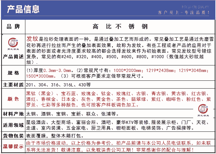所屬行業(yè):不銹鋼板 | 主要客戶:裝飾公司,電梯公司,門飾公司。 | |