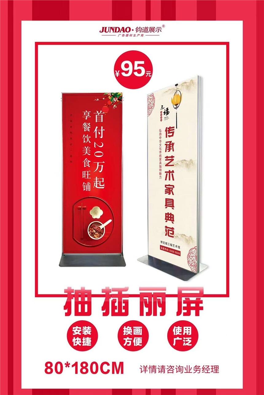 麗屏展架的常見問題 1:磁條款和卡槽款的區(qū)別 兩種款式材質(zhì)都是相同的,只是安裝方法上有所差別 價格:磁條款>卡槽款 2:如何更換廣告,方便嗎? 只是簡單更換廣告板,很方便 卡槽款:先拆卸頂部框架,從頂部開口處重新插入新的廣告板,然后安裝頂部框架即可 磁條款:在新的廣告板背面重新粘上新磁條后吸上展架即可 |