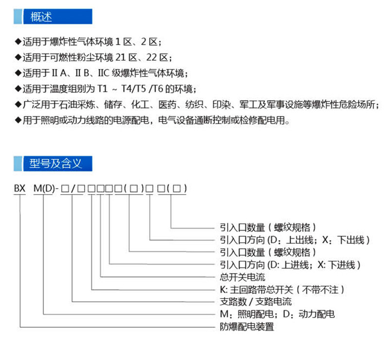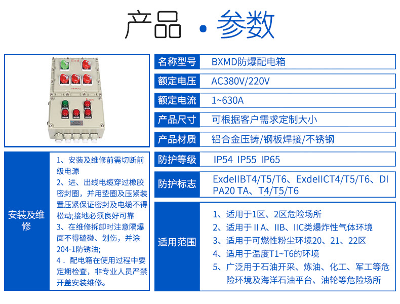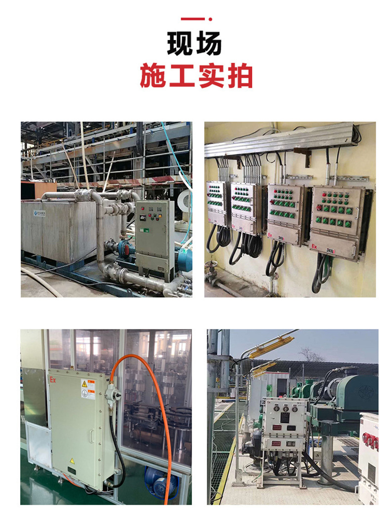 bxm防爆配電控制箱bxk照明動力電源儀表箱IIC接線柜廠家直供適用范圍 1、爆炸性氣體混合物風(fēng)險場所:1區(qū)、2區(qū)。 2、性氣體混合物:ⅡA、ⅡB、ⅡC。 3、可燃性粉塵環(huán)境20區(qū)、21區(qū)、22區(qū) 4、溫度組別:T1~T6。 5、防爆標(biāo)志:ExdeⅡBT6、*ExdeⅡCT6。 5.詳細(xì)歸納運(yùn)用場所如室內(nèi),外作業(yè)場所,我國煤炭行業(yè),中石油,中石化,中海油,電力,治 金,鐵路,鋼鐵,船舶,,航空航天,消防,化工,*部門,場館,交通運(yùn)輸,及大 型企業(yè)適用需要。 注:要求ⅡC級請注明。; bxm防爆配電控制箱bxk照明動力電源儀表箱IIC接線柜廠家直供主要技術(shù)參數(shù): 1.履行規(guī)范:GB 3836.1、GB 3836.2、GB 3836.3、GB 12476.1、IEC 60079 2.防爆標(biāo)志:ExdeⅡBT6、DIP A20 TA,T6 3.額定電壓:AC 220V/380V 4.主回路額定電流:20A~250A 5.支路數(shù):2、4、6、8、10、12 6.支路額定電流:1A、3A、5A、10A、15A、20A、25A、32A、40A、50A、60A 7.防護(hù)等級:IP54(ⅡB)、IP55(DIP)、IP65(配防雨罩) 8.防腐等級:WF1 9.進(jìn)口規(guī)格:G1/2~G3 10.適用電纜外徑:Φ6~Φ55mm 11.進(jìn)線口方向:下進(jìn)下出、下進(jìn)上出、進(jìn)步上出或進(jìn)步下出 bxm防爆配電控制箱bxk照明動力電源儀表箱IIC接線柜廠家直供產(chǎn)品展示圖: