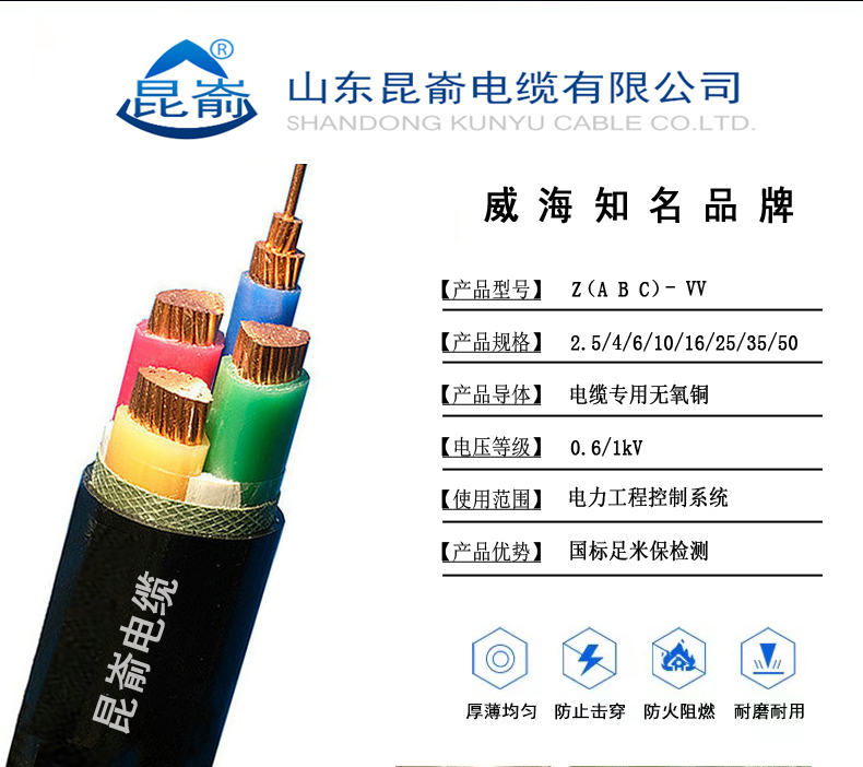 威海電纜供應(yīng)文登昆崳品牌阻燃電纜ZRVV3X6+4三相四線6 平方4芯5芯銅芯電纜 |