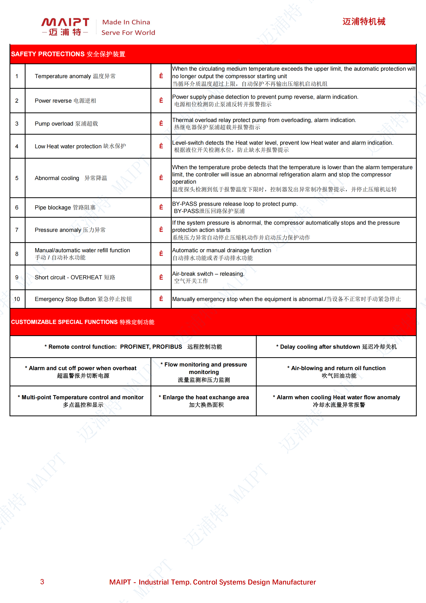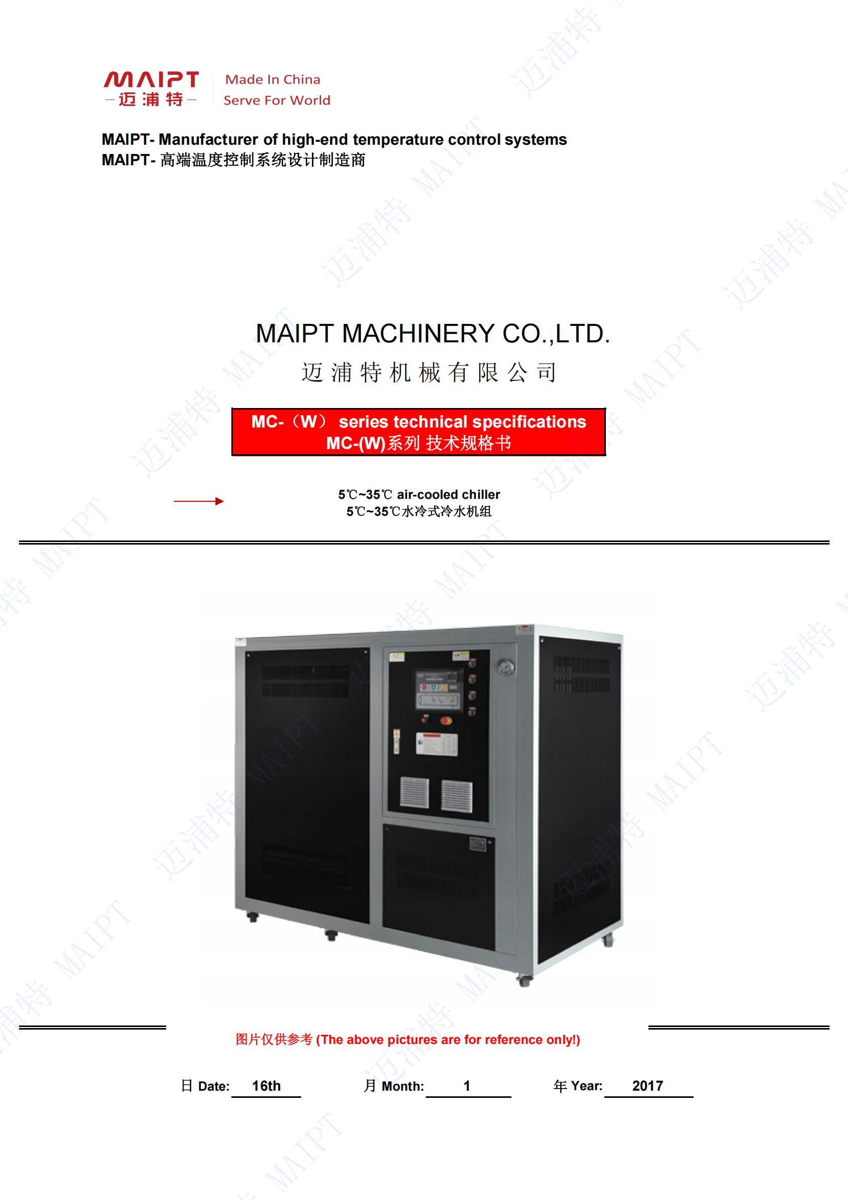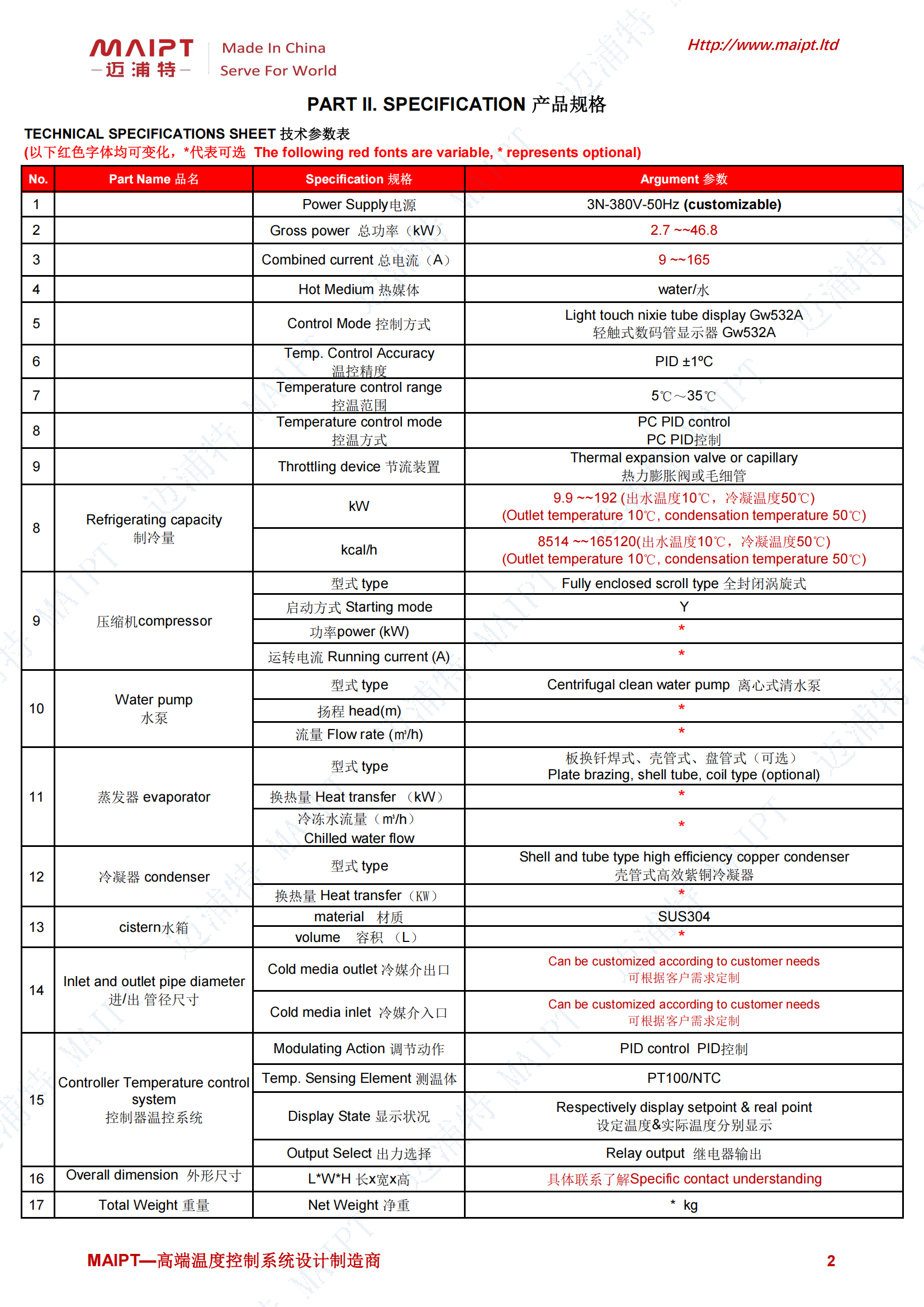 郵:zhaoyuanyuan@maipt.ltd 用途特點核心優(yōu)勢精準潔凈控溫高效穩(wěn)定運行多重安全防護技術(shù)參數(shù)(典型機型)適配場景適用于醫(yī)用注射器注塑冷卻、手術(shù)器械滅菌設(shè)備降溫、體外診斷試劑生產(chǎn)環(huán)境控溫等場景。進出管徑可根據(jù)生產(chǎn)設(shè)備接口定制,支持遠程控制、流量監(jiān)測等特殊功能擴展,且享有 1 年免費保修服務(wù),為醫(yī)療器械生產(chǎn)提供可靠冷卻支持。 醫(yī)療器械生產(chǎn)工業(yè)冷水機組技術(shù)規(guī)格書樣本