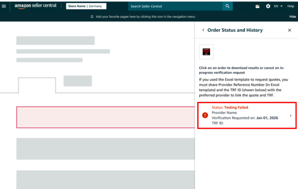 ?? 步驟四:選擇寄送樣品的實驗室地址 請注意:選定實驗室后,您可直接與其合作,寄送樣品并安排物流。若對服務(wù)不滿意,可更換其他TIC進行洽談。如已有測試報告,請查閱“常見問題”部分。此外,所有因測試或驗證產(chǎn)生的費用將由您自行承擔。 ?? 步驟五:確認報價,寄送樣品或者提交測試報告審核 ?? 步驟六:等待檢測完成,結(jié)果將自動上傳到亞馬遜 ?? 步驟七:檢查合規(guī)狀態(tài) 如果驗證失敗,您可以重新啟動驗證流程 注意:提供給亞馬遜的所有測試文件都必須顯示 “通過” 或 “不適用 (NA)” 的結(jié)果。 顯示結(jié)果為 “失敗”、“不合規(guī)”、“未滿足” 或空白的結(jié)果將不被接受。