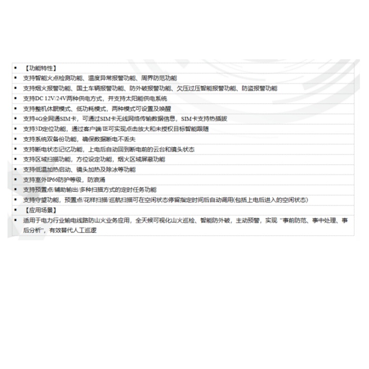 支持煙火報警功能、國土車輛報警功能、防外破報警功能、欠壓過壓智能報警功能、防盜報警功能