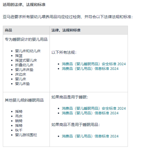 搖籃 搖籃通常用于為 0 至 6 月齡嬰兒提供睡眠環(huán)境。搖籃四周有護(hù)欄。它由搖擺底座支撐,或者可以在固定底座上搖擺。在靜止(不搖擺或不擺動(dòng))時(shí),搖籃的睡眠表面與水平面的夾角應(yīng)不超過 7 度。 搖籃式嬰兒床 搖籃式嬰兒床通常用于為 0 至 4 月齡嬰兒提供睡眠環(huán)境。搖籃式嬰兒床四周有護(hù)欄。它由獨(dú)立支腿、固定框架或支腿、輪式底座、搖擺底座或可以相對(duì)于固定底座搖擺的底座支撐。在靜止(不搖擺或不擺動(dòng))時(shí),搖籃式嬰兒床的睡眠表面與水平面的夾角應(yīng)不超過 7 度。 折疊幼兒床 折疊幼兒床又稱旅行幼兒床或嬰兒圍欄,是可供嬰幼兒使用的床,可折疊裝入袋中,方便攜帶。它們通常比標(biāo)準(zhǔn)嬰兒床或幼兒床輕得多,有柔軟護(hù)欄,可供嬰兒舒適睡眠。折疊幼兒床可以包括便攜式幼兒床以及帶底板的嬰兒圍欄。本政策不適用于沒有底板的嬰兒圍欄。 嬰兒床床墊 專用于搖籃式嬰兒床、床邊床、搖籃或嬰兒床使用或者針對(duì)其設(shè)計(jì)或營(yíng)銷的床墊。 床邊床 拼接床又稱床旁嬰兒床,旨在固定在普通床的一側(cè),以便讓嬰兒睡在看護(hù)人的附近。 嬰兒游戲圍欄 嬰兒游戲圍欄是一種便攜的框架式圍護(hù)結(jié)構(gòu),由網(wǎng)眼或織物非剛性側(cè)面和地板組成,專為嬰兒或幼兒玩耍和睡眠而設(shè)計(jì)。 游戲圍欄地墊 專門適合嬰兒游戲圍欄使用或者針對(duì)其設(shè)計(jì)或營(yíng)銷的便攜式地墊。 搖椅 搖椅是一種自立式商品,用于在看護(hù)人的幫助下或以其他方式為處于斜躺姿勢(shì)的嬰兒提供支撐,以便嬰兒可以搖動(dòng)。嬰兒搖椅用于尚不具備獨(dú)自坐立能力的嬰兒(大約 0 至 6 個(gè)月)。有些嬰兒搖椅可能會(huì)配有兒童可以觸及的配件桿。 吊床 吊床通常由織物制成,懸掛在嬰兒床的兩個(gè)或多個(gè)點(diǎn)上,或懸掛在支架或天花板上,專用于安撫嬰兒或者為安撫嬰兒而設(shè)計(jì)或營(yíng)銷。 躺椅 固定或可調(diào)姿勢(shì)的傾斜式座椅,專用于安撫嬰兒或者為安撫嬰兒而設(shè)計(jì)或營(yíng)銷。 搖椅 搖椅是一種帶曲面底座的固定座椅,允許嬰兒手動(dòng)搖晃,專用于安撫嬰兒或者為安撫嬰兒而設(shè)計(jì)或營(yíng)銷。 秋千 嬰兒搖籃秋千是一種帶有框架和機(jī)械裝置的穩(wěn)固型商品,可以讓無法獨(dú)自坐立的嬰兒搖擺。嬰兒坐式搖籃適用于從新生兒至能夠獨(dú)立坐穩(wěn)的嬰兒。嬰兒搖籃秋千可以通過電池、交流電源適配器、發(fā)條裝置或其他方式提供動(dòng)力。 嬰兒非睡眠用品 嬰兒非睡眠類用品是指任何用于嬰兒但并非為睡眠設(shè)計(jì)或營(yíng)銷的商品。這些商品通常是為日間使用而設(shè)計(jì)的,在嬰兒醒來時(shí)為嬰兒提供支撐、舒適度或娛樂。 適用的法律、法規(guī)和標(biāo)準(zhǔn)