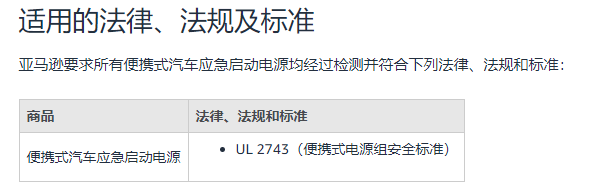 | 美國便攜式汽車應急啟動電源UL 2743(便攜式電源組安全標準) |
